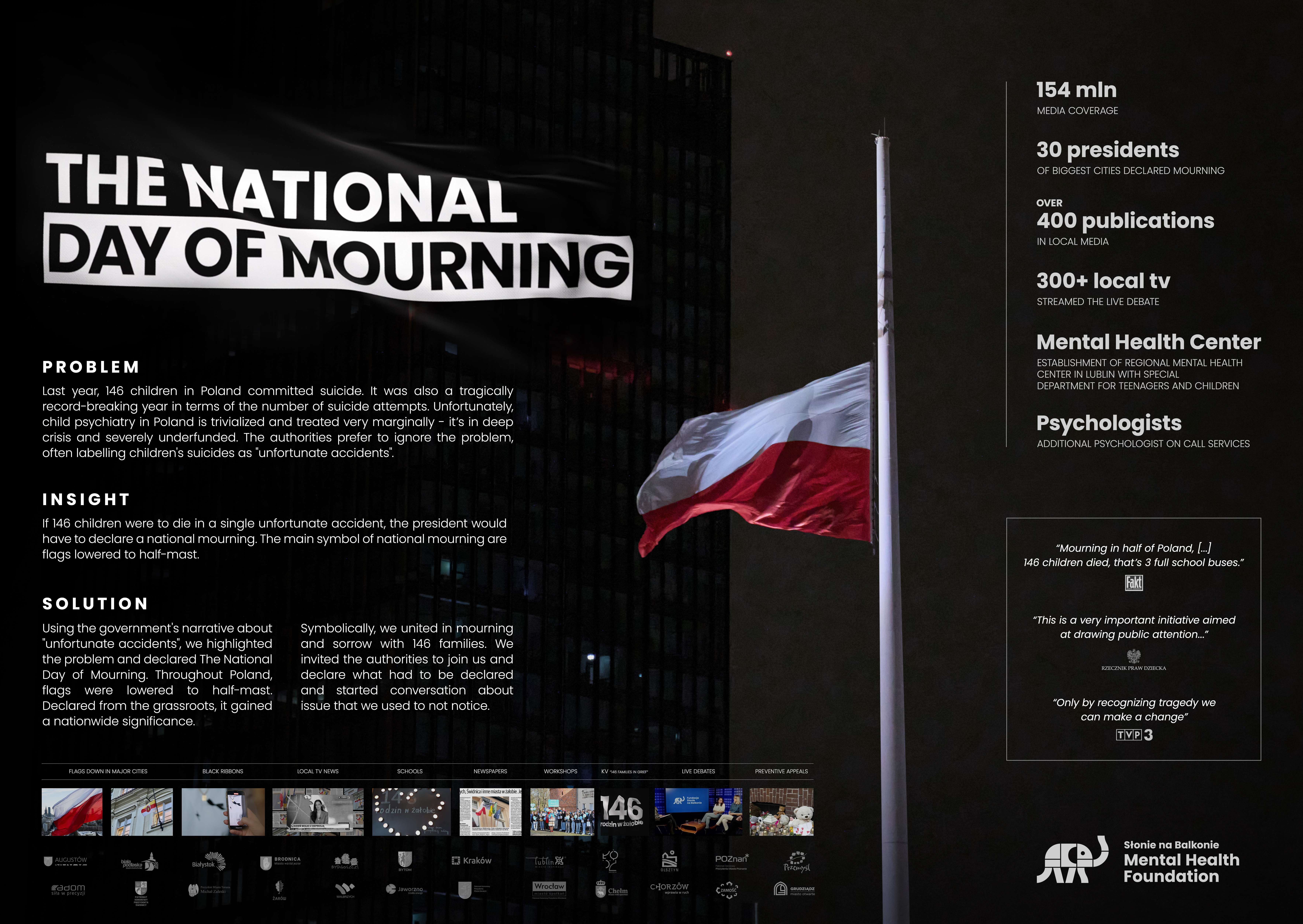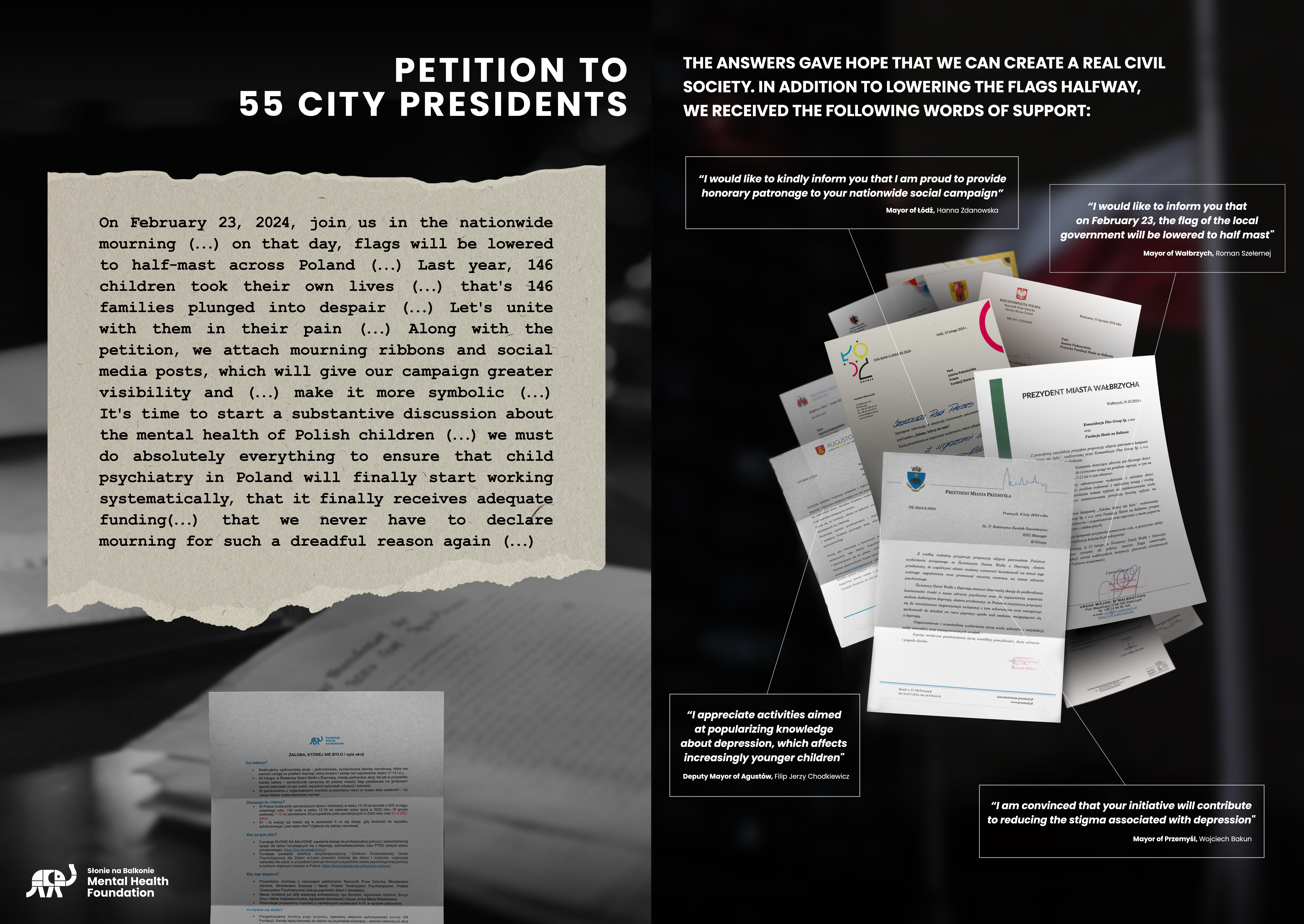 W Polsce, w przypadku największych tragedii, w których wiele osób traci życie, prezydent często ogłasza Dzień Żałoby Narodowej. W zeszłym roku, w naszym kraju, 146 dzieci popełniło samobójstwo – to kolejny niechlubny rekord. Zaprosiliśmy 55 prezydentów największych miast do ogłoszenia żałoby, aby w ten sposób zwrócić uwagę na rosnący problem.